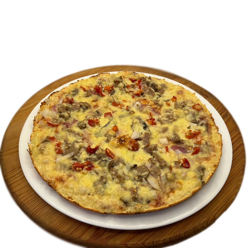 základ, sýr, šunka, žampiony (konzervované), cibule, tuňák (konzervovaný), feferonky