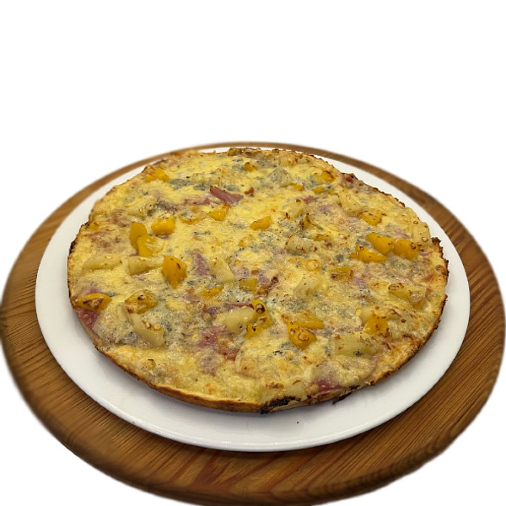 základ, sýr, niva, šunka, ananas (kompotovaný), broskev (kompotovaná)