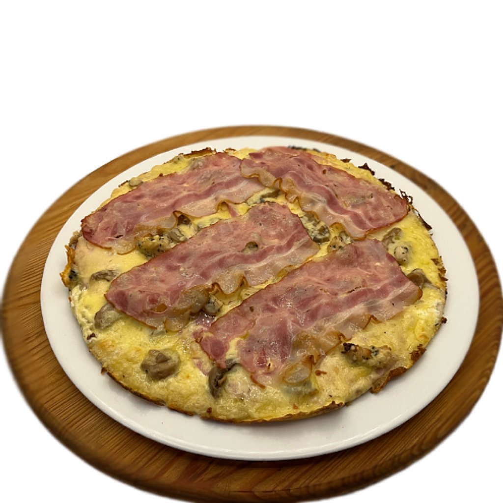 základ (kysaná smetana), sýr, šunka, kuřecí maso (marinované), žampiony (konzervované), slanina