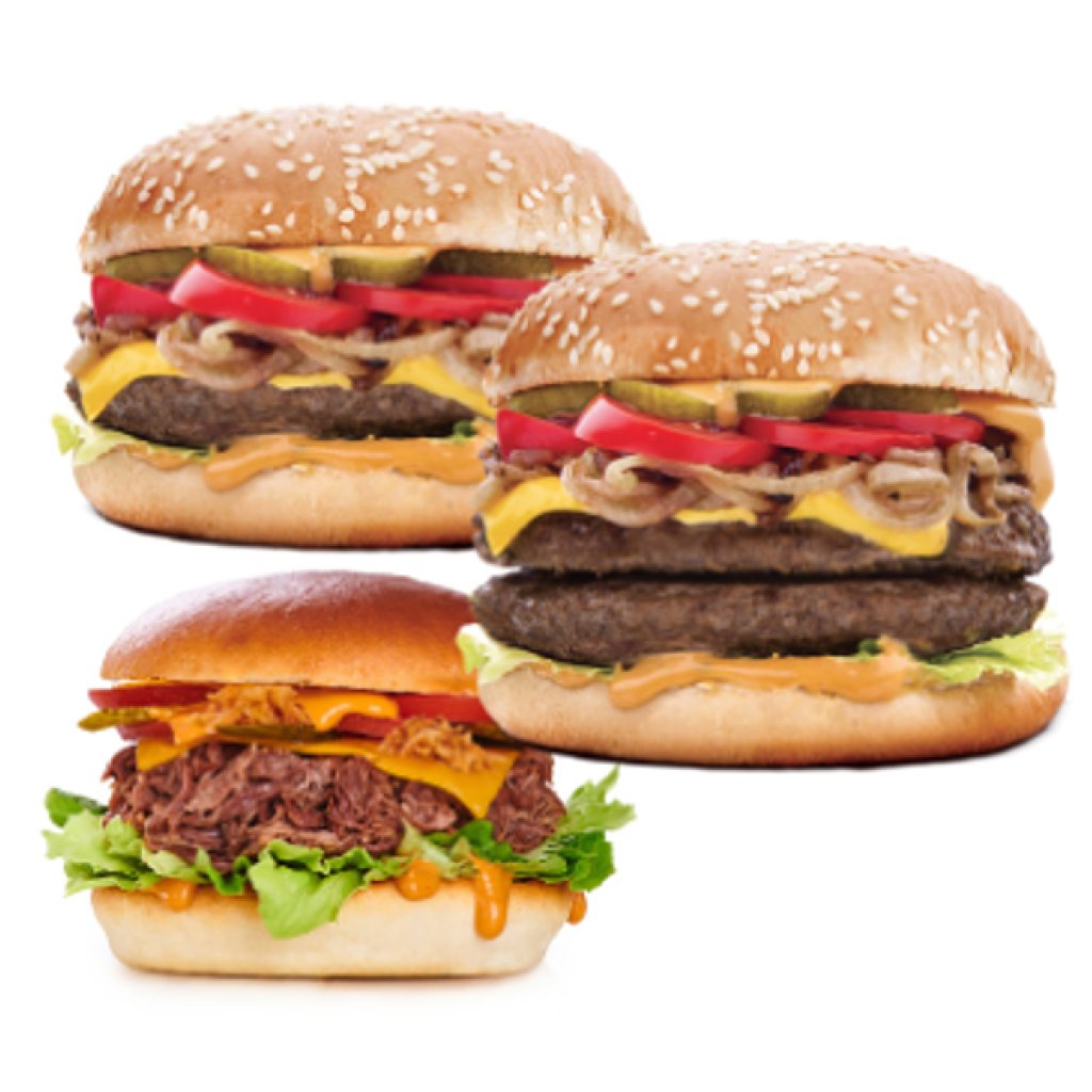 bulka, maso dle výběru, sýr typu cheddar, ledový salát, smažená cibulka, nakládaná okurka, rajče, barbecue dresink