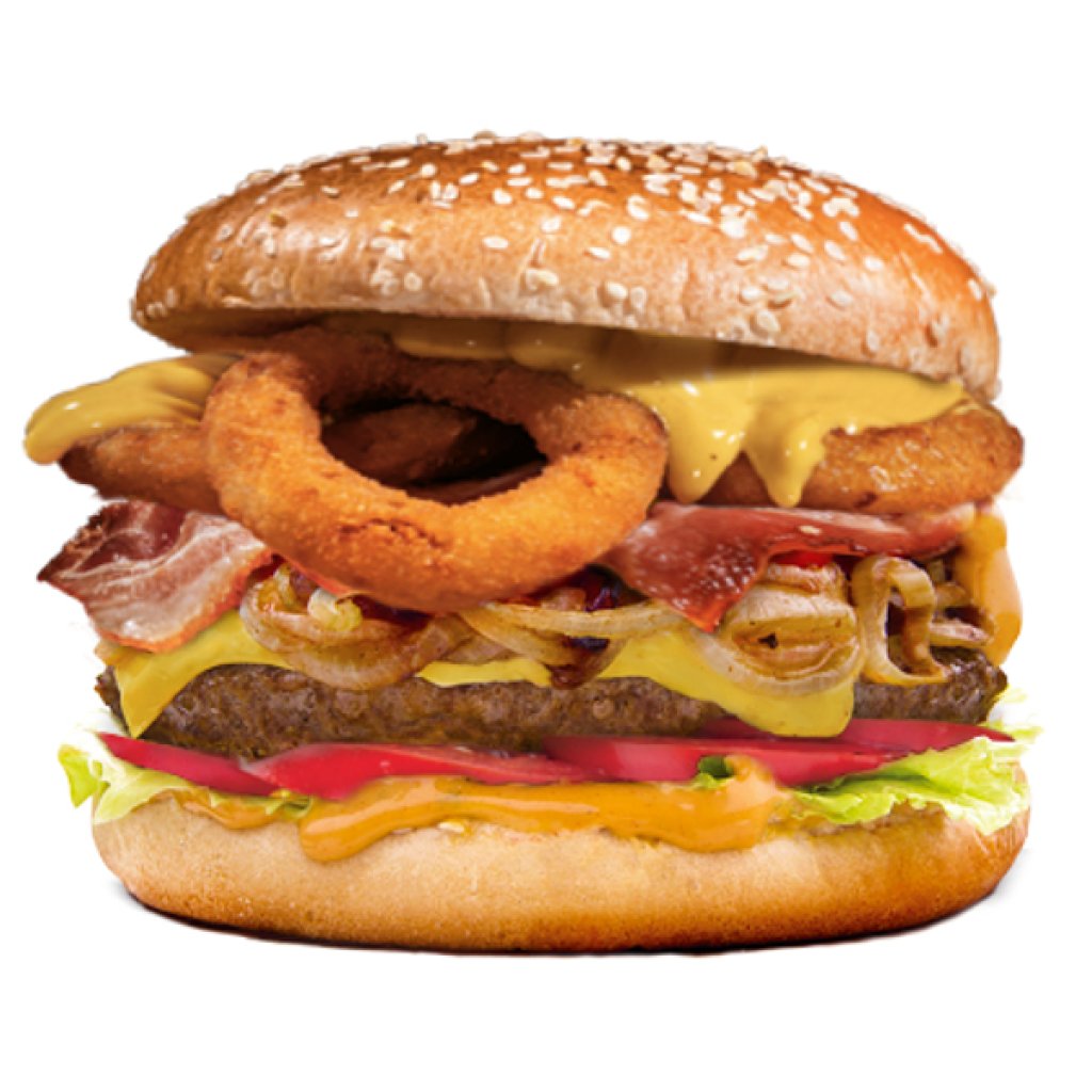 bulka, maso dle výběru, sýr typu cheddar, ledový salát, smažená cibulka, nakládaná okurka, rajče, BBQ original dresink, opečená slanina, cibulové kroužky
