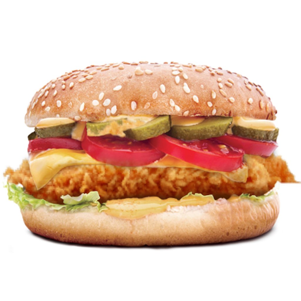 bulka, 3 obalované kuřecí stripsy, sýr typu cheddar, ledový salát, rajče, nakládaná okurka, french dresink