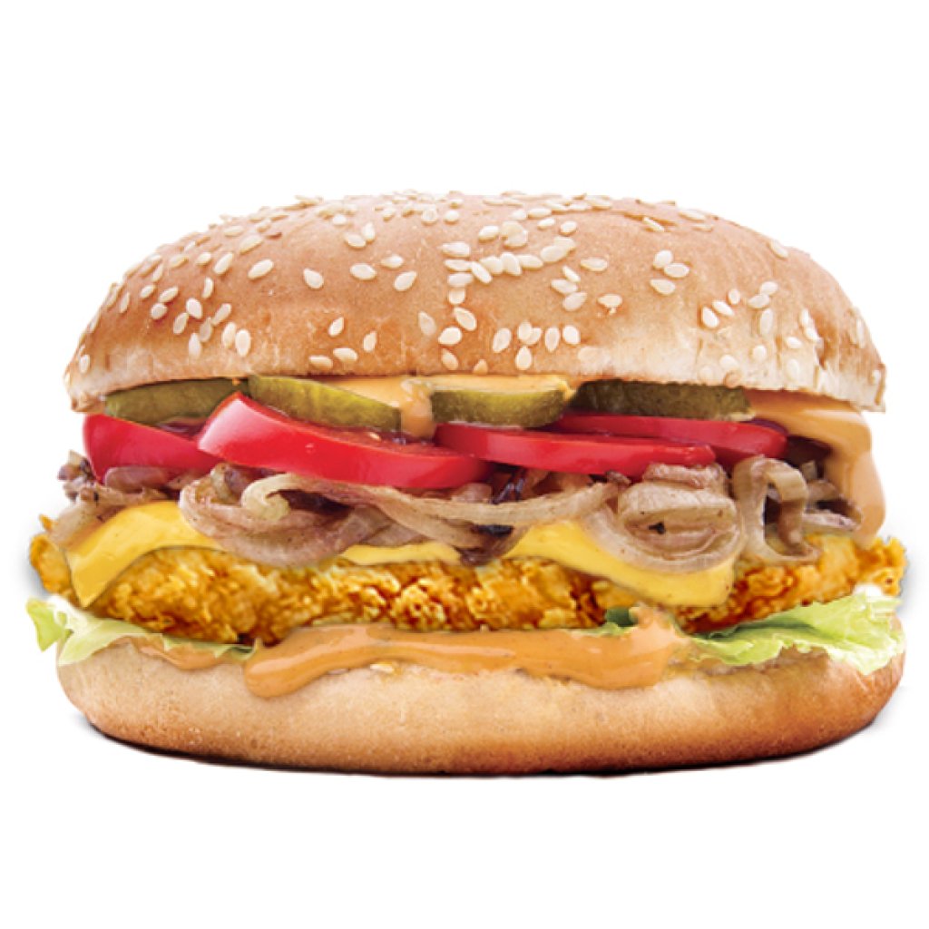 bulka, 3 obalované kuřecí stripsy, sýr typu cheddar, ledový salát, smažená cibulka, nakládaná okurka, rajče, barbecue dresink