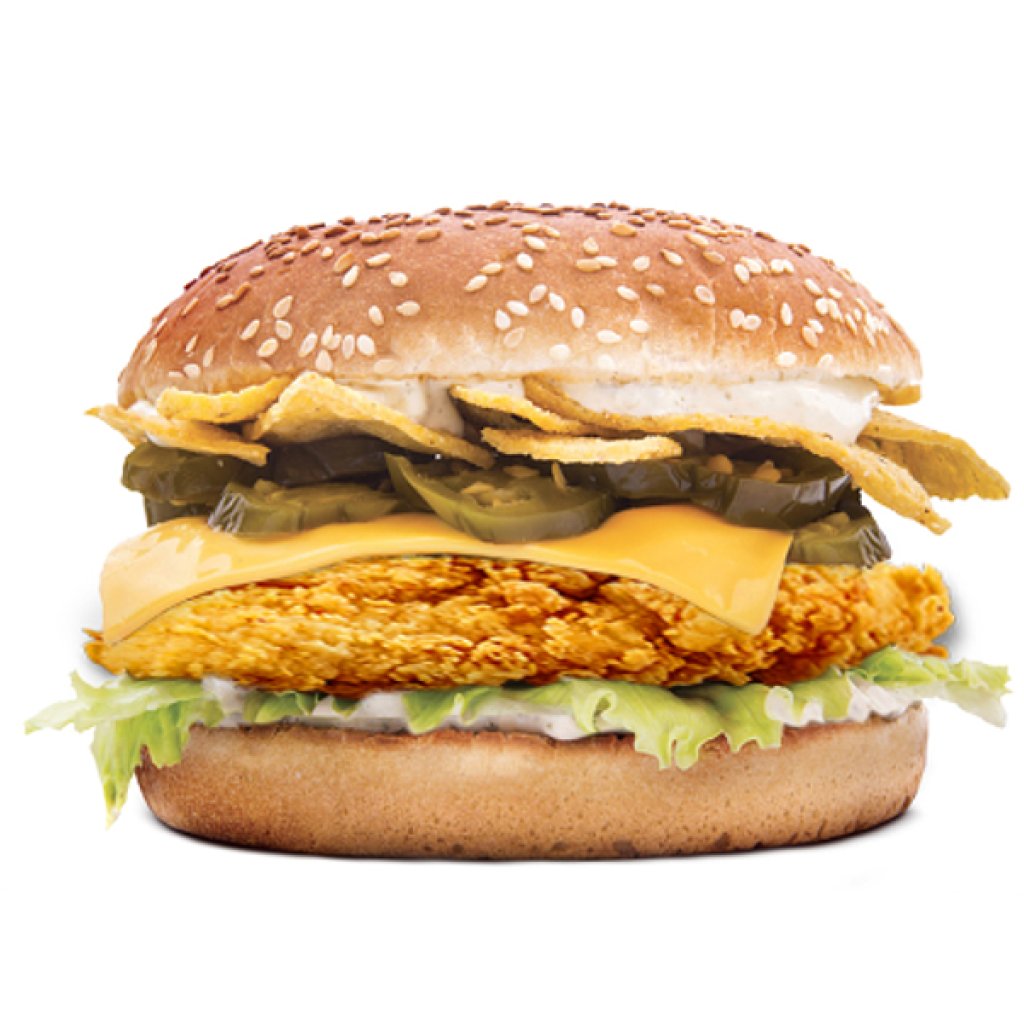 bulka, 3 obalované kuřecí stripsy, sýr typu cheddar, ledový salát, jalapeño papričky, nachos chipsy, jalapeňo dresink