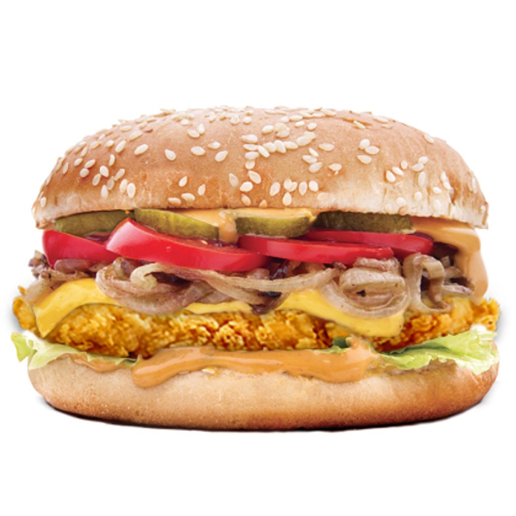 bulka, 3 obalované kuřecí stripsy, sýr typu cheddar, ledový salát, smažená cibulka, nakládaná okurka, rajče, BBQ original dresink