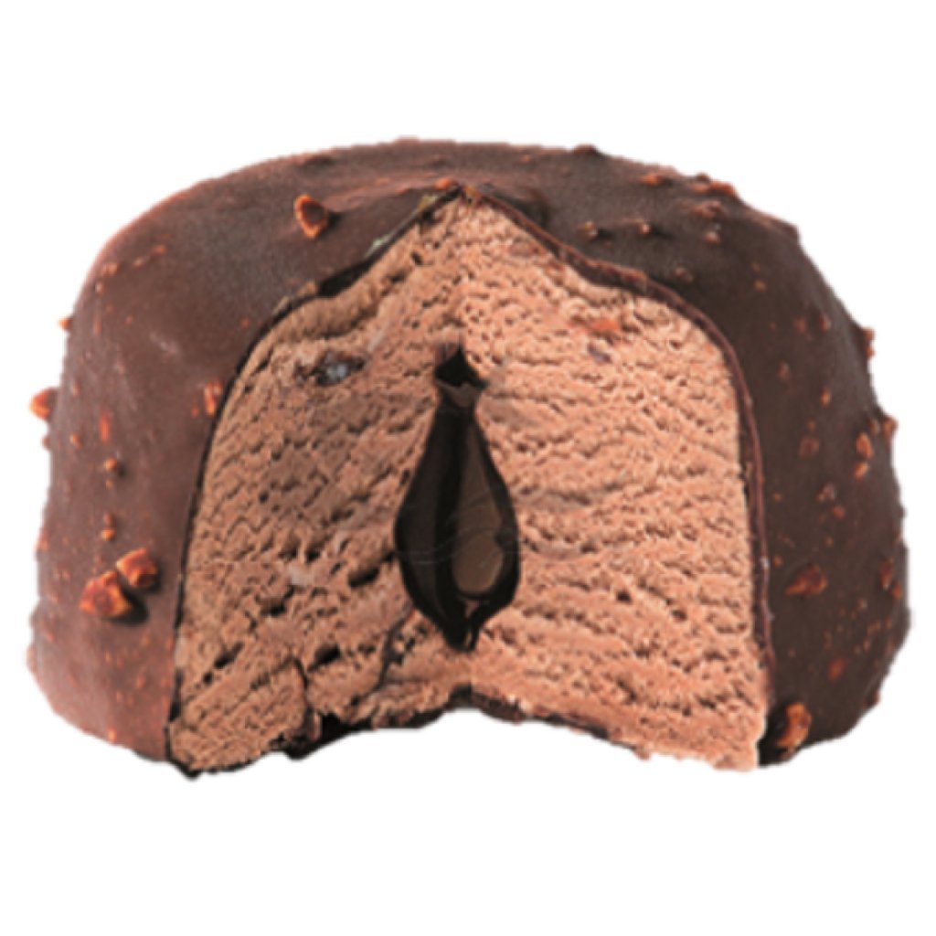 Dortík z čokoládové zmrzliny s krémovou čokoládovou náplní uprostřed, zalitý čokoládovou polevou s kousky mandlí.
